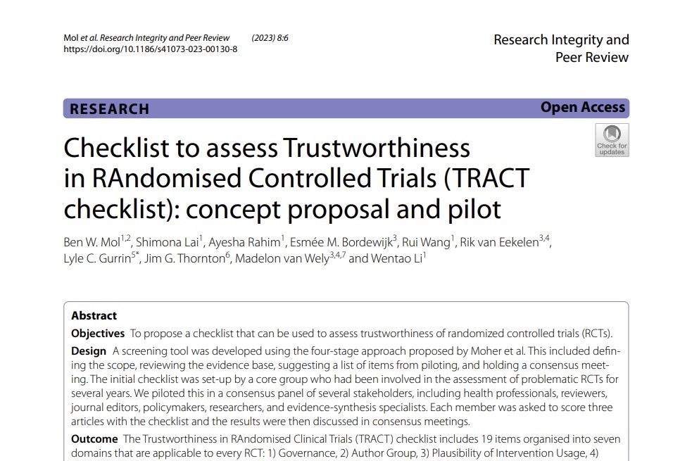 We have developed the Trustworthiness in RAndomised Controlled Trials checklist (acronym TRACT) to assess the trustworthiness of RCTs and other studies. Explanation here. The TRACT checklist can be used by reviewers, editors, systematic reviewers and guideline makers to check potential relevant RCTs for trustworthiness.